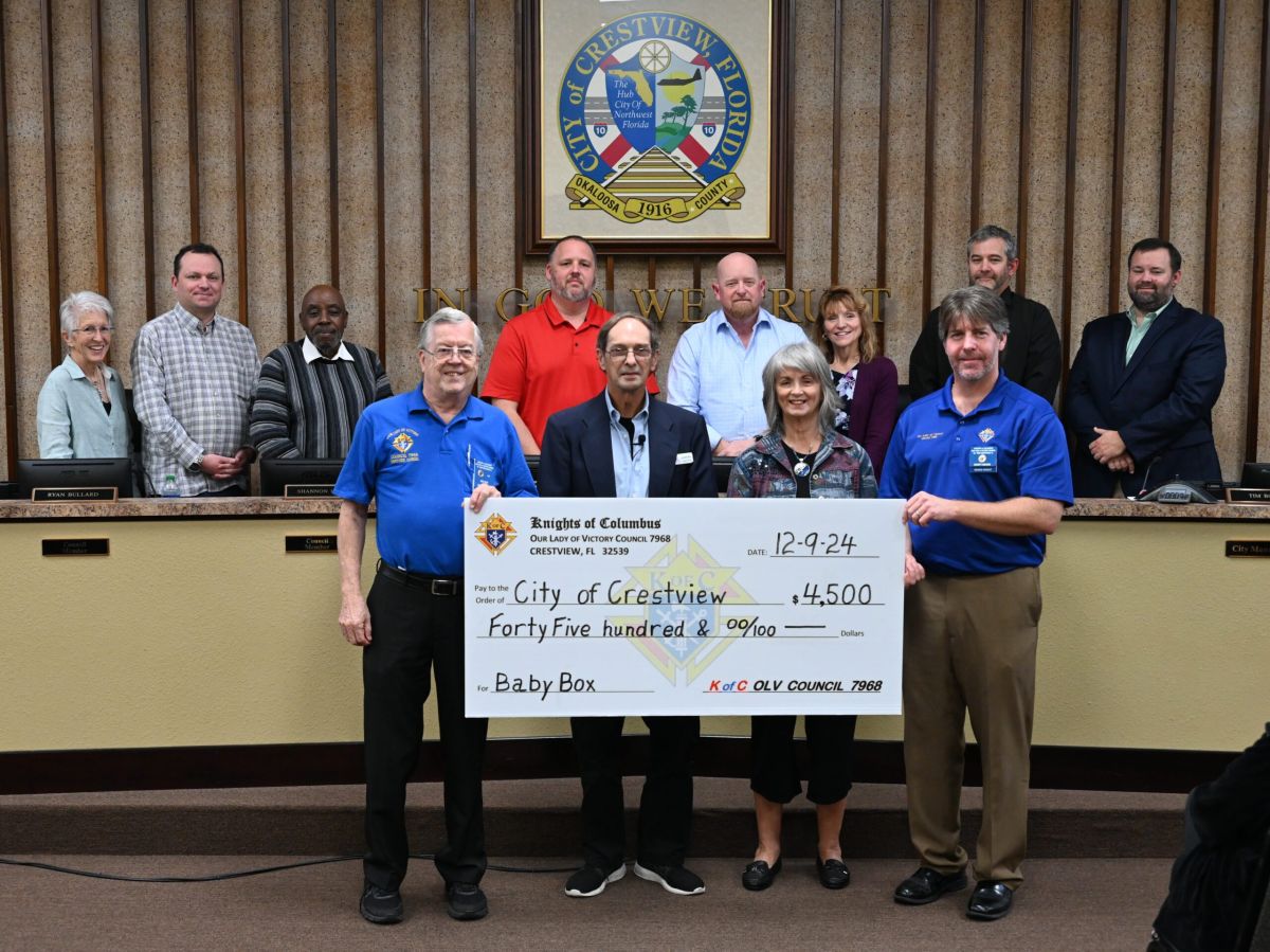 At Monday’s Crestview City Council meeting, members of the Knights of Columbus Council 7968 of Our Lady of Victory Catholic Church donated $4,500 to help cover the costs of the city’s Safe Haven Baby Box at Fire Station 1.