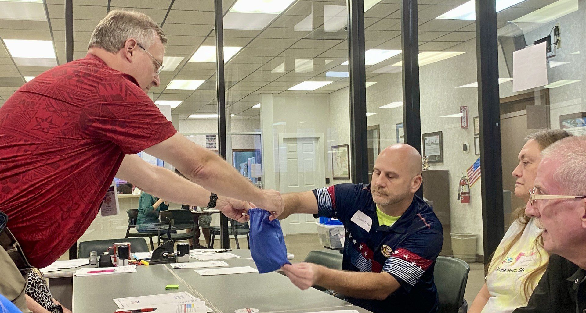 Shawn Cogan reaches for a tag from a bag held by Okaloosa County Supervisor of Elections Paul Lux while Theresa and Mike Blizzard look on. (Photo by Tony Judnich)