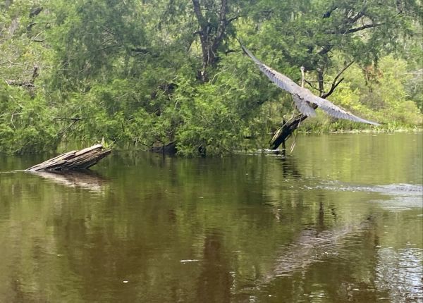 A great blue heron heads upstream on Rocky Creek. (Photo by Tony Judnich)