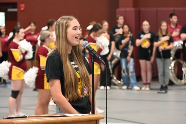 Baker School student Ava Mullins sings the national anthem at today’s ceremony. (Photo by Tony Judnich)