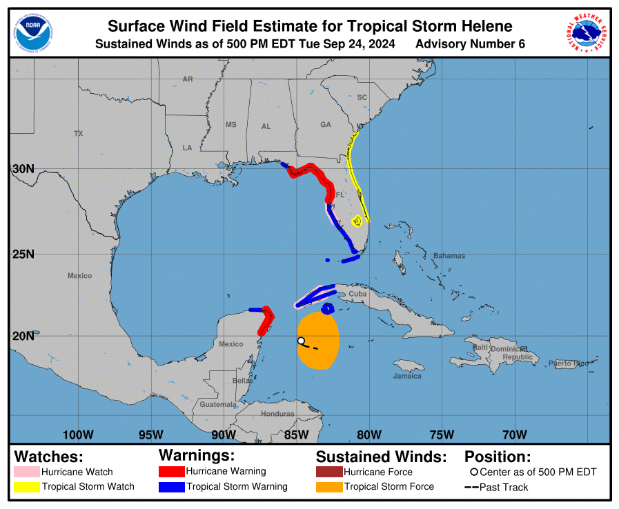 At 500 PM EDT (2100 UTC), the center of Tropical Storm Helene was located near latitude 19.7 North, longitude 84.7 West. Helene is moving toward the west-northwest near 12 mph (19 km/h). A turn toward the northwest is expected tonight, followed by a general northward motion beginning on Wednesday and continuing through Friday. On the forecast track, the center of Helene will pass near the northeastern coast of the Yucatan Peninsula on Wednesday, move across the eastern Gulf of Mexico on Wednesday and Thursday, and reach the Big Bend coast of Florida late Thursday. Maximum sustained winds have increased to near 50 mph (85 km/h) with higher gusts. Additional strengthening is forecast, and Helene is expected to become a hurricane on Wednesday. The storm is forecast to rapidly strengthen over the eastern Gulf of Mexico and become a major hurricane on Thursday. Tropical-storm-force winds extend outward up to 175 miles (280 km) to the east of the center.