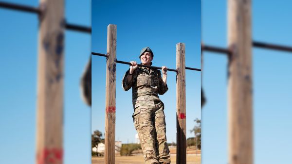 Chief Master Sgt. Tiffany Zaloudek, Deputy SERE Career Field Program Manager, completes rounds of pull-ups on Joint Base San Antonio-Chapman Training Annex, Texas, on Oct. 5, 2024. Zaloudek is the first female SERE Specialist to earn the rank of Chief Master Sgt. and has spent her career proving that women can be both strong and feminine.