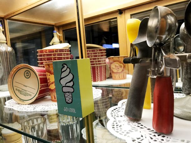 From the vast collections of residents Wanda and Mark Hulion comes a diverse array of ice cream-related serving dishes, vintage packages, signs, churns and almost 70 assorted scoops.