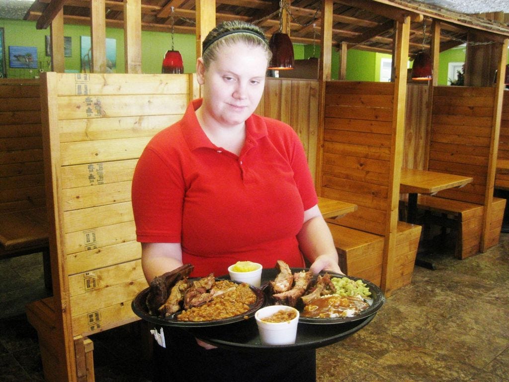 “Miss Sherry smokes these herself out back,” waitress Jessica Nelson said as she served two overflowing barbecue rib platters to residents Juanita and H.W. Worley.