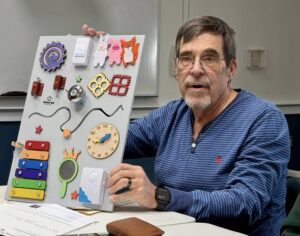 Paul Farnsworth, president of the Friends of the Crestview Library, holds one of the library’s child-development sensory boards purchased by the Friends group. (Credit: Friends of the Crestview Library)