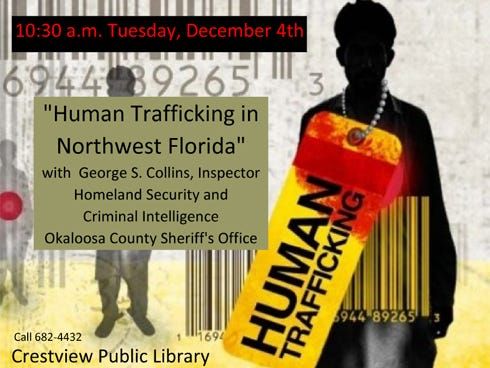 CRESTVIEW — Human trafficking will take focus at 10:30 a.m. Dec. 4 at the Crestview Public Library. Inspector George S. Collins, of the Okaloosa County Sheriff’s Office, will discuss “Human Trafficki…
