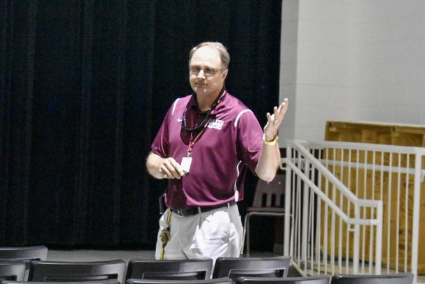 BAKER — Baker School Principal Mike Martello held a parent meeting on Monday evening to discuss changes to the car and bus traffic flow.