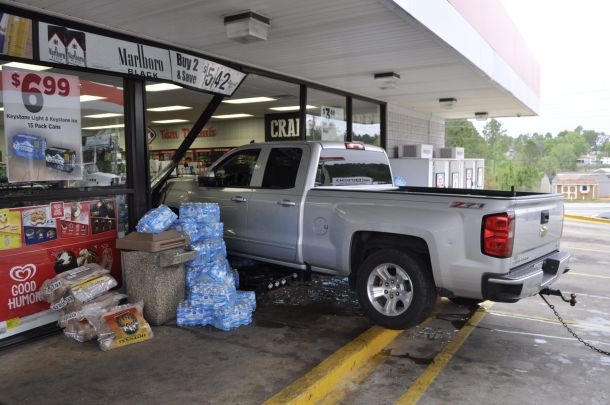 The driver of a Chevrolet Silverado pickup truck drove through the windows at the front of the store, loc…