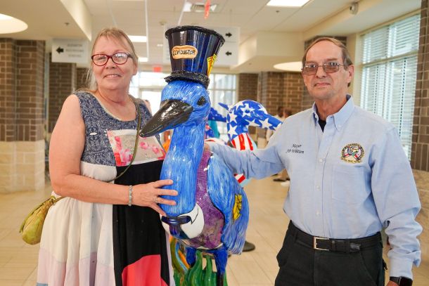 A prefabricated, 5-foot-tall, and three-dimensional fiberglass great blue heron dressed as a train conductor is about to make a permanent landing at Crestview’s Wilson Street Park.