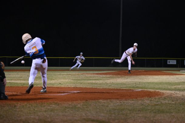 An outstanding performance on the mound and plate discipline gave Baker a 12-2 victory to start the season.