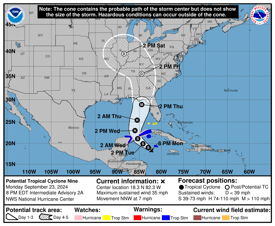 The National Hurricane Center warned that while the most likely path of the system shows landfall in North Florida’s Big Bend region or in the Panhandle, storm surge, wind, and rain will affect areas well away from the center of the storm, particularly to the east of its eye.