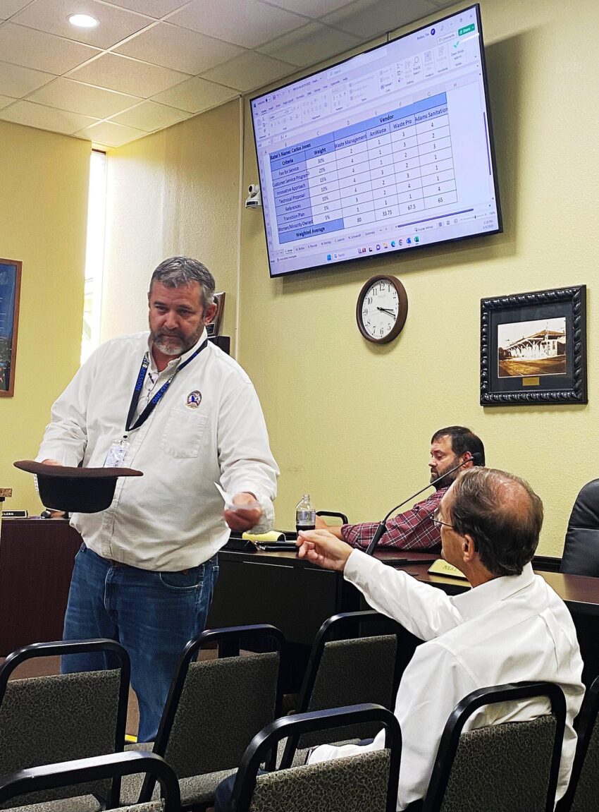 Crestview City Manager Tim Bolduc, left, randomly selects the names of the top three trash collection firms bidding on the city’s new solid waste collection contract. Mayor JB Whitten, right, read the names of the firms in the order in which they would make formal presentations to city officials.