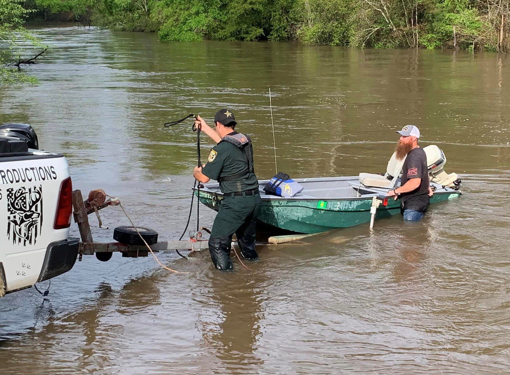 Daniel Hunter (right) gets help from the Okaloosa County Sheriff’s Office in pulling his boat out of the Shoal River. Hunter’s boat capsized while he was refueling it and he had to walk miles to get back to his truck.