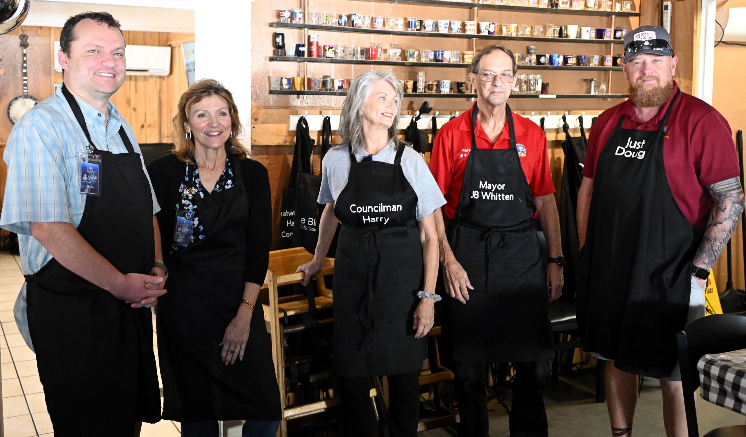 Crestview City Councilman Ryan Bullard, City Clerk Maryanne Schrader, Councilwoman Cynthia Brown, Mayor J.B. Whitten and Councilman Doug Capps prepare to help out at Hub City Smokehouse on Oct. 20 during Florida City Government Week. Brown wore an apron that was once worn by former Councilman Harry LeBoeuf Jr.
