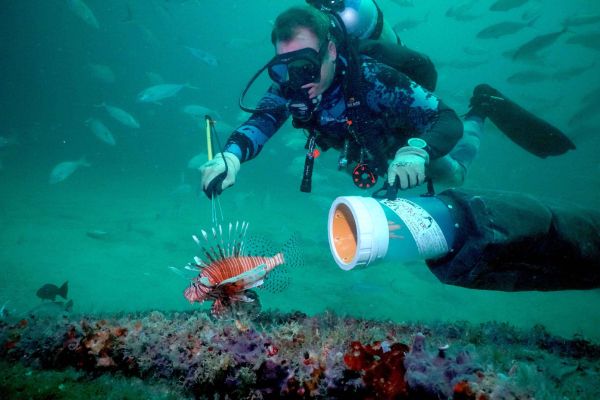 A diver prepares to snag a lionfish. (Photo courtesy of Okaloosa County)