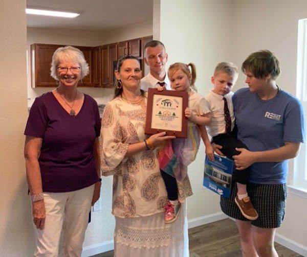 Embroiderer's Guild members present sampler to Habitat for Humanity homeowners