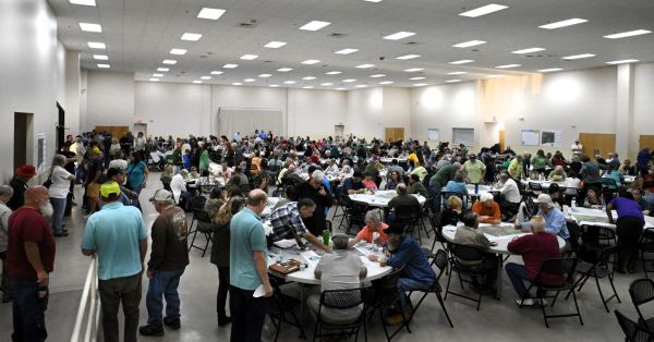 Baker resident Liz Bears quickly peeled stickers from pages and gave them to scores of north Okaloosa County area residents and other folks who filed past her at the Crestview Community Center on Wednesday evening.