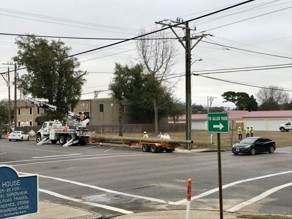 A crew loads utility poles on Jan. 24 at South Wilson Street and Martin Luther King Jr. Avenue in Crestview. (Photo courtesy of Brian Hughes)