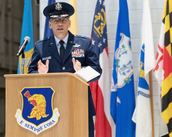 Brig. Gen. Mark Massaro speaks during his change of command ceremony inside the McKinley Climatic Lab at Eglin Air Force Base, Fla., July 3, 2024. Massaro assumed command from Brig. Gen. Jeffery Geraghty during a ceremony presided over by Maj. Gen. Evan Dertien, Air Force Test Center commander. (U.S. Air Force photo by Michelle Gigante)