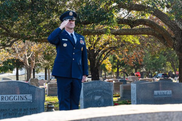 U.S. Air Force Col. Kaveri Crum, 1st Special Operations Wing deputy commander, salutes a gravestone during the Wreaths Across America Placement Ceremony at Beal Memorial Cemetery, Florida, Dec. 14, 2024. Wreaths Across America is a nonprofit organization dedicated to honoring and remembering America’s fallen heroes by coordinating wreath-laying ceremonies at cemeteries and memorial sites across the country, with a mission to “Remember, Honor, Teach” about the sacrifices of U.S. veterans and their families.